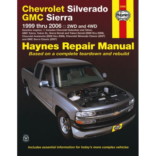 Silverado and GMC Sierra Haynes Repair Manual for 1999 thru 2006 Full-size Light-duty Gasoline Engine Models. Includes 2000 thru 2006 Suburban, Tahoe, Yukon, Yukon XL, Sierra Denali. 2001 thru 2006 Yukon Denali. 2002 thru 2006 Chevrolet Avalanche. 2007 Chevrolet Silverado Classic and 2007 GMC Sierra Classic and Sierra Denali Classic. Does not include 1999 and 2000 C/K Classic, 1999 and 2000 Sierra Classic, diesel, 8.1L engine, CNG, hybrids, models equipped with rear-wheel steering and heavy-duty model information. Does not include 1999 and 2000 C/K Classic, 1999 and 2000 Sierra Classic, diesel, 8.1L engine, CNG, hybrids, models equipped with rear-wheel steering and heavy-duty model information