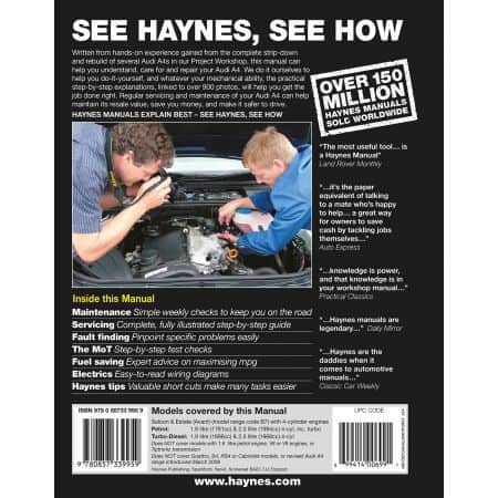 Saloon and Estate (Avant) (model code B7) with 4-cylinder engines. , Petrol: 1.8 litre (1781cc) and 2.0 litre (1984cc) 4-cyl, inc. turbo. , Turbo-diesel: 1.9 litre (1896cc) and 2.0 litre (1968cc) 4-cyl. Does NOT cover Quattro, S4, RS4 or Cabriolet, models with Tiptronic transmisson, or revised A4 range introduced March 2008. Does NOT cover 1.6 litre or V6 or V8 engines. Does NOT cover V6 diesel engines, Does NOT cover Quattro, S4, RS4 or Cabriolet models, or revised Audi A4 range introduced March 2008